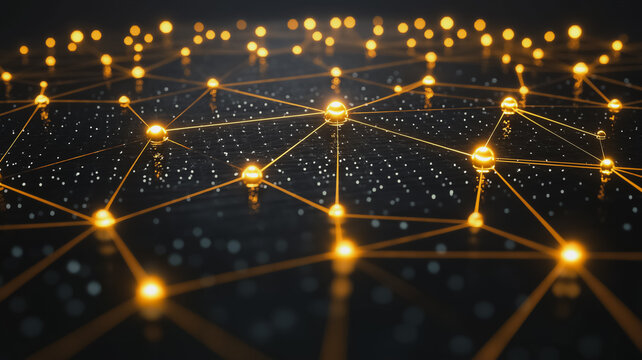 A network of glowing spheres is displayed on a black background. The spheres are connected to each other in a web-like pattern, creating a sense of interconnectedness and complexity. Concept of a vast