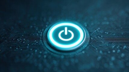 Glowing blue power button with futuristic digital elements