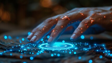 Human Hand Interacting With Futuristic Holographic Interface, Technology And Innovation Concept.