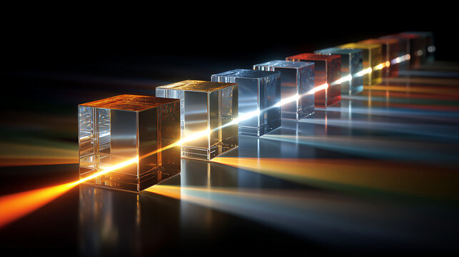 Colorful light refraction through crystal prisms on reflective surface