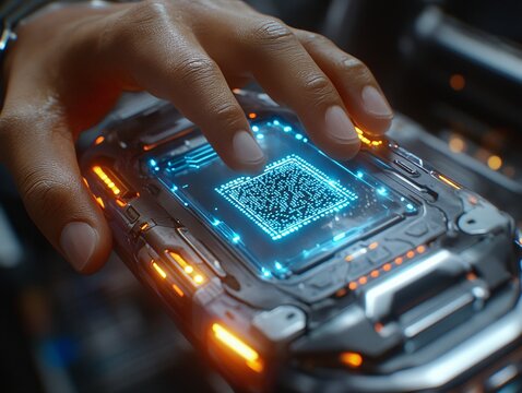 A futuristic device displays a glowing QR code, with a hand poised to interact, showcasing advanced technology and digital connectivity.