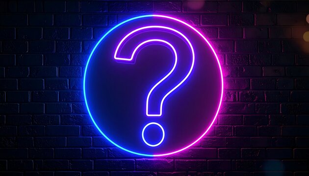 Glowing neon question mark in a circle on a brick wall