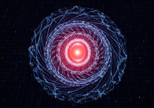 Vibrant abstract glowing vortex of energy with a fiery red core swirling in a dark cosmic background representing power and motion