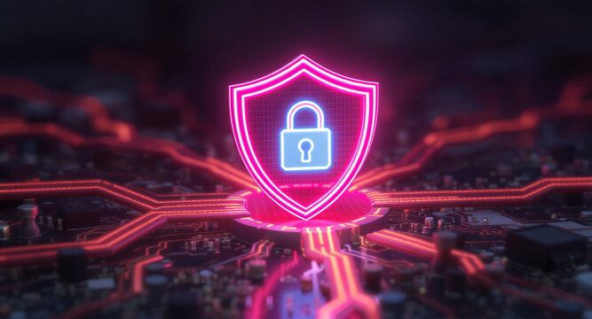 Digital firewall visualization: A brightly glowing shield, with a pink outline and a blue padlock icon inside, acts as a central hub on a complex motherboard. Glowing red data lines flow towards it.