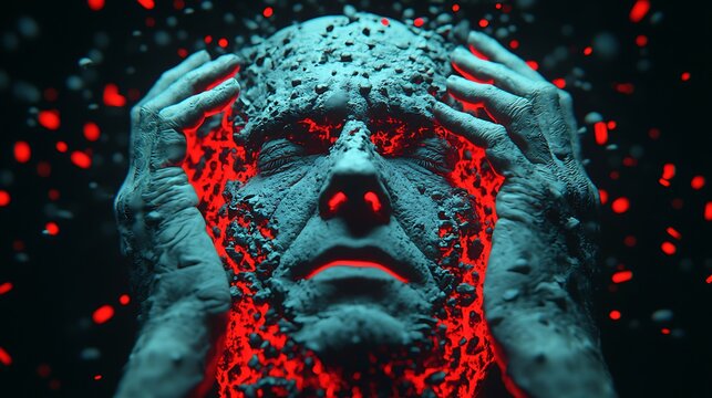 A digital illustration of a human head in profile made of glowing blue and red particles on a dark background
