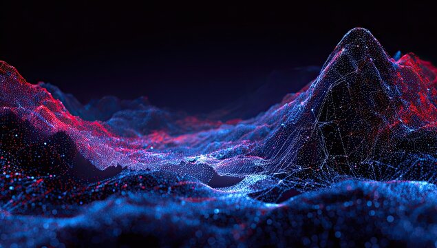 Abstract digital landscape of red and blue glowing data points forming peaks