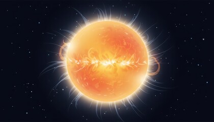 Bright solar explosion in space with an orange glow and fiery flames of red and yellow light