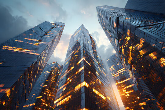 Glowing sunset skyline with spire-topped tower and reflective glass skyscrapers