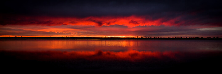Fiery red sunrise glowing above calm lake waters