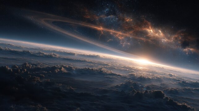 A vibrant cosmic scene of a ringed planet rising over a nebula