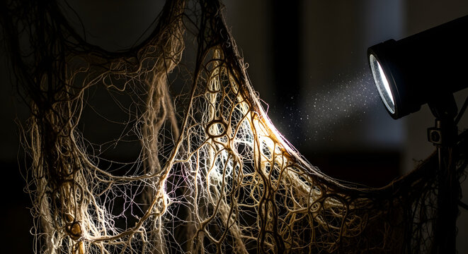 Detailed view of mycelium network with glowing mushrooms in a subterranean environment