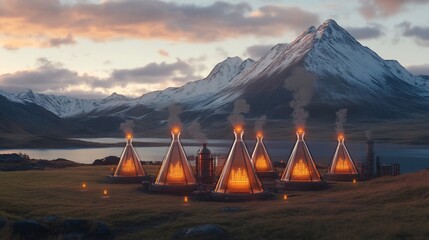 Fantasy mountain range shaped like chemistry beakers glowing the peaks science landscape