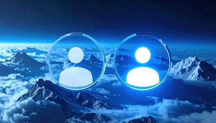 Two glowing user icons encased in glass over a snowy mountain range under a deep blue, cloudy cosmic sky