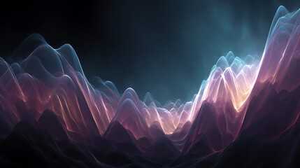 Soft glowing streams shaping an ethereal mountain range landscape with purple and blue hues in a dark background with surreal and mysterious