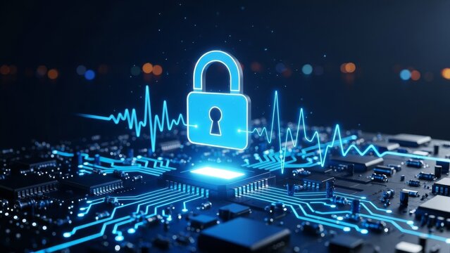 Digital security padlock icon over futuristic circuit board with glowing blue lines