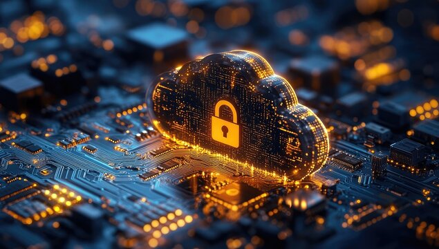 A glowing cloud with a padlock hovers over a computer chip, representing cloud security