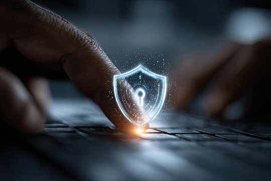 A hand's fingertip hovers over a glowing shield and keyhole graphic, suggesting digital security