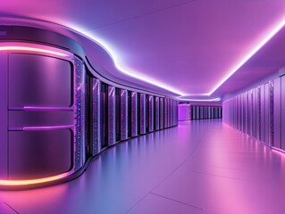 High-tech data center corridor with colorful lighting and server racks showing advanced technology and digital design