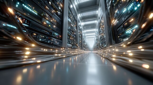 Glowing server racks in high-tech data center hallway