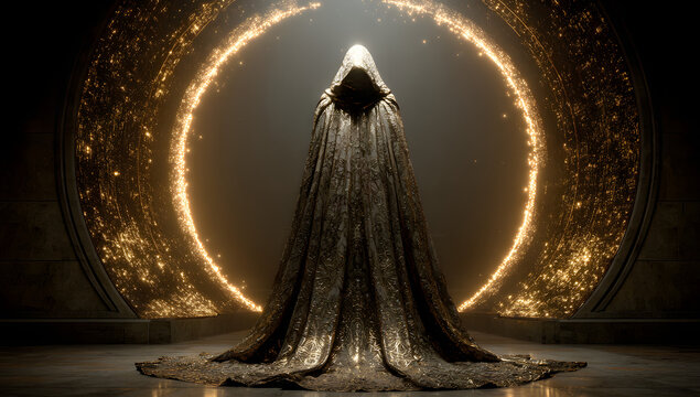 Mysterious spirits in white robes stand solemnly in a traditional Asian temple courtyard at night. Lanterns illuminate the scene as purple lights adorn a large tree. Hungry Ghost Festival.