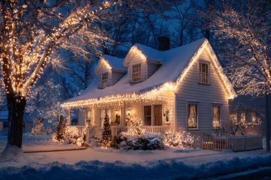 Golden string lights over snowy garden path at dusk creating cozy warm glow