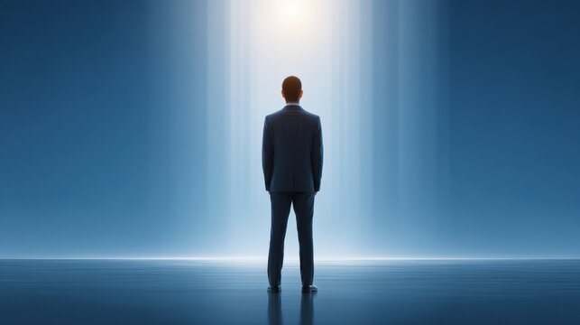Silhouette of a person in front of glowing blue moon jellyfish tank, ambient lighting with floating aurelia aurita in aquarium background