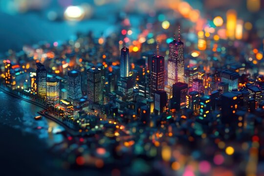 Illuminated cityscape model with glowing skyscrapers on water