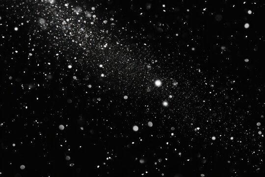 Ethereal white particles and glowing specks floating against a deep black background, creating a mysterious and serene starry atmosphere