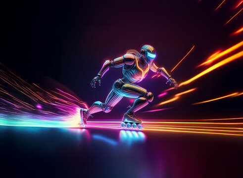 A futuristic robot, clad in metallic armor, speed skates across a neon-lit track, leaving vibrant trails of light in its wake.  The scene is dynamic and energetic, showcasing advanced technology and m