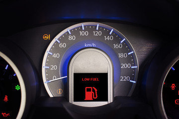 Close-up shot of glowing fuel gauge on the dashboard