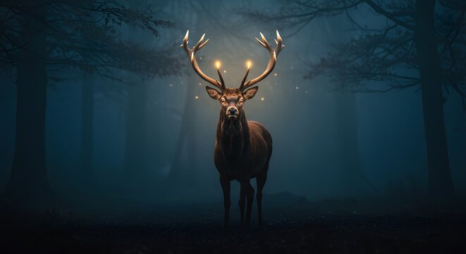 A majestic brown stag with glowing antlers stands in a dark, misty forest at night, illuminated by magical, ethereal lights