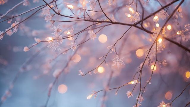 Snow-laden branches glowing with warm string lights at twilight, falling snow bokeh