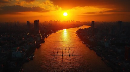 Stunning sunset over urban skyline with dramatic clouds