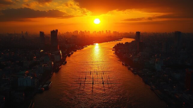 A vibrant sunset over the sea and river, with fiery colors in the sky, bright clouds, and the beauty of nature