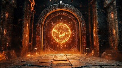 Mystical portal in stone chamber with glowing symbols and ancient runes