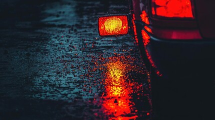 Car with orange tail lights on dark road, Rear of car at night with glowing lights, Night journey or travel concept image