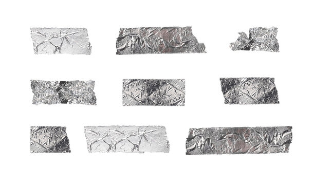 Silver tapes set. Adhesive torn, ripped, crumpled shining paper strips isolated on white background.