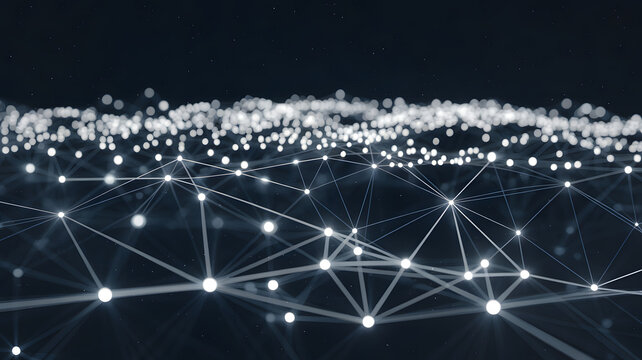Dynamic digital network connecting glowing spheres with vibrant energy pulses, representing futuristic data flow and complex systems