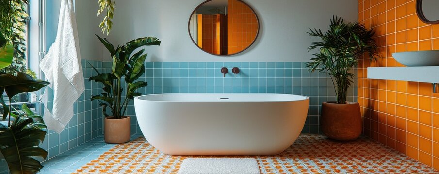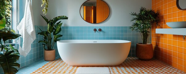 Modern bathroom with vibrant tiles and elegant bathtub decor