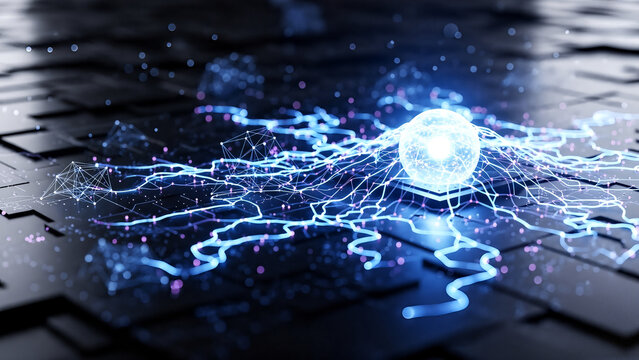 A glowing blue network visualization on a dark, tiled surface viewed from directly above