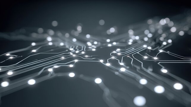 intricate network of glowing white circuit board traces and nodes on a subtle gradient background representing technology