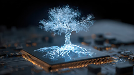 Majestic ancient tree with glowing roots intertwined with futuristic digital data streams and circuits symbolizing the fusion of nature and technology in a mystical forest setting