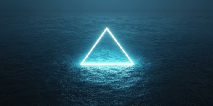 A minimalist neon triangle pointing downwards, glowing in icy blue with a subtle electric effect on a dark smooth surface
