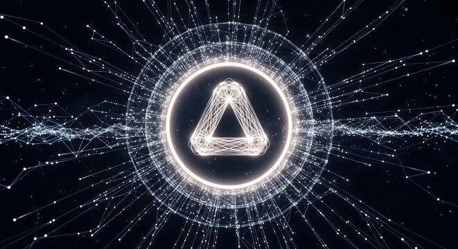 Futuristic glowing triangle symbol in dark space with dynamic connections