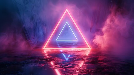 Neon pink and blue triangle is lit up in a dark room. The room is empty and the triangle is the only object in the scene. The neon lights give the room a futuristic and mysterious atmosphere