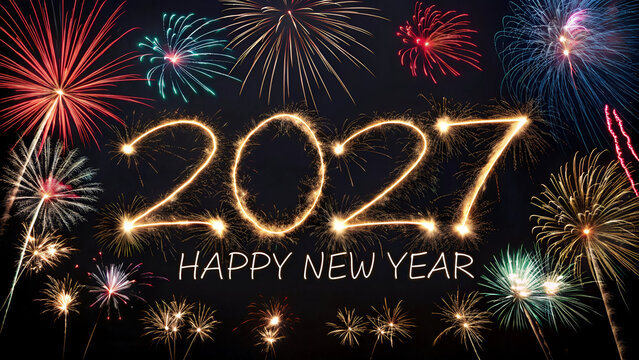 Year 2027 written in glowing sparkler typography with colorful fireworks, celebrating Happy New Year on a black night sky.