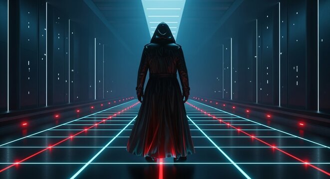 Cyberpunk figure in dark trench coat standing on glowing neon grid floor inside futuristic server room or digital corridor