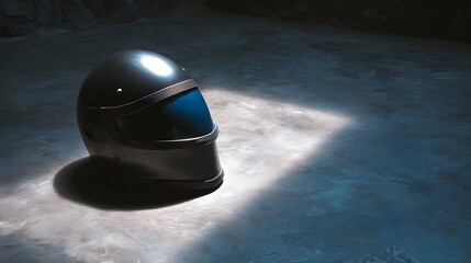 A black motorcycle helmet with glowing blue visor on a dark surface, viewed from the front, showcasing its protective features and neon illumination