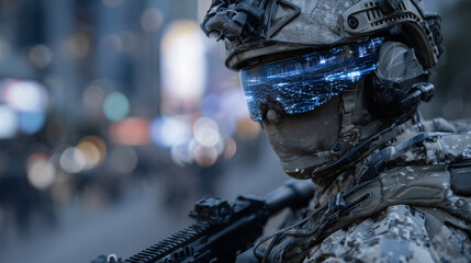 A futuristic robot soldier in advanced armor aims a high-tech weapon, glowing red visor highlighting its readiness for combat.