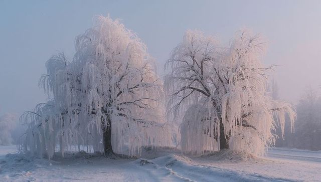 Frost-covered weeping willows at twilight with hoarfrost and pastel sky in snowy meadow